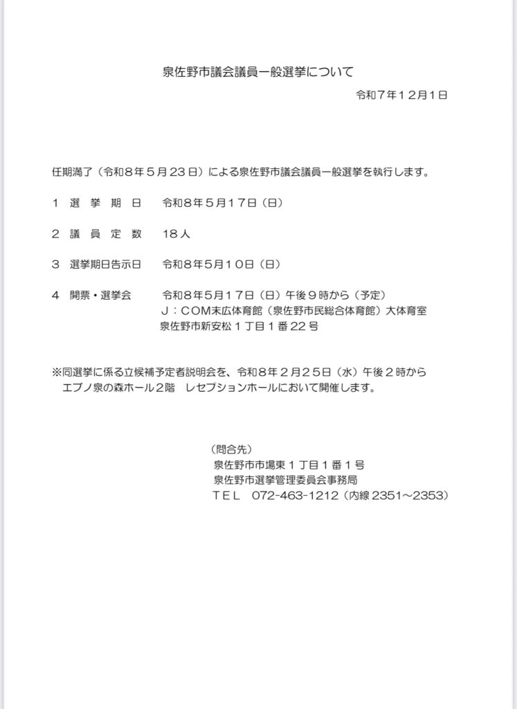 次回の泉佐野市議会議員選挙について、来年5月17日投開票ということが報道提供されました。