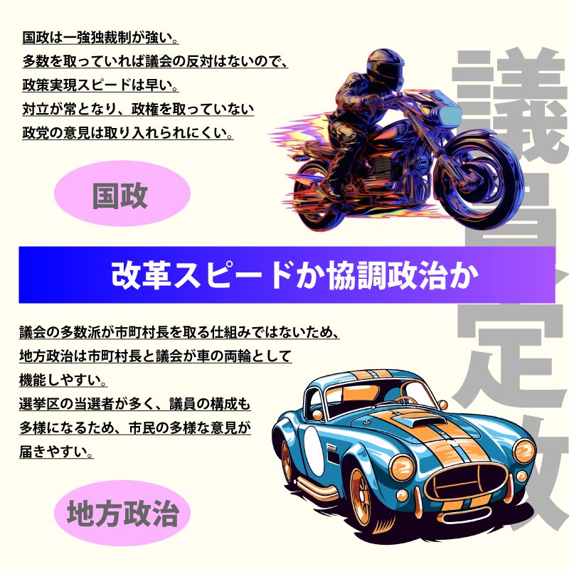 地方政治が違うのは、市町村長は議会とは別の選挙で選ばれますので、議会の多数派がトップを取る仕組みではなく、議会は首長の監視や審議を適切に行うことになり、首長と議会が車の両輪として機能しやすい仕組みとなります。
