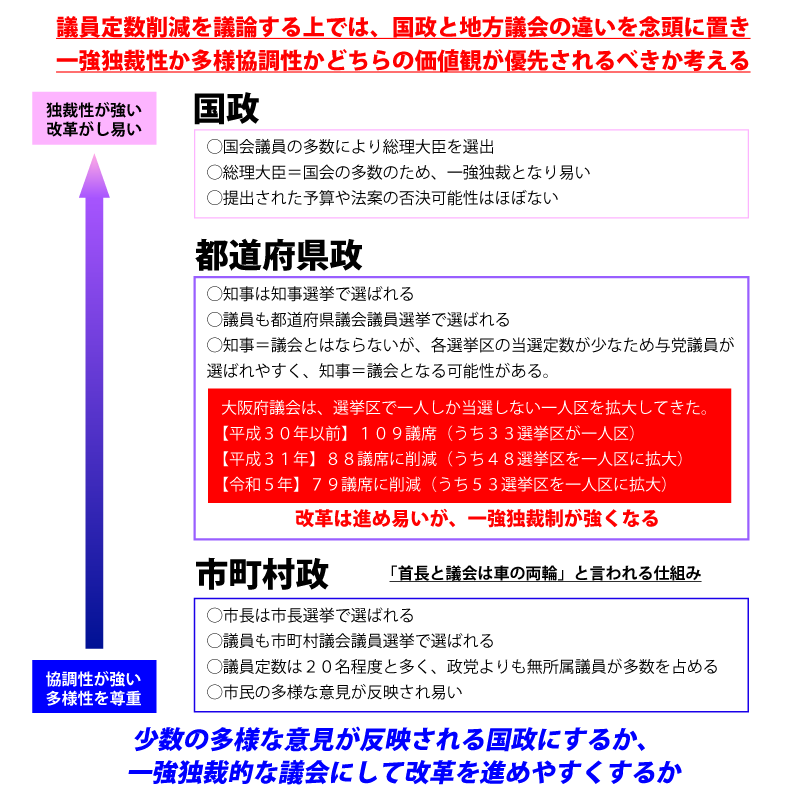 この間にあるのが、都道府県政で、特に大阪府議会はほとんどの選挙区で1人しか当選できない仕組みへと議員定数を削減してきましたので、ほぼ維新の議員で占められ、知事へのチェック機能は弱いと考えられます。