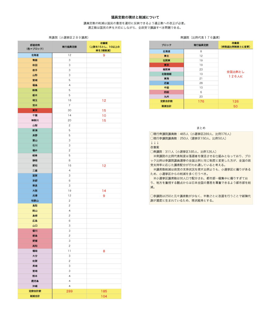 ※小選挙区議席数は対人口で配分され、都市部一極集中に偏りすぎており、地方を重視する観点からは日本全国の意思を尊重できるよう都市部を削減。