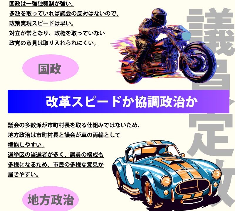 地方政治が違うのは、市町村長は議会とは別の選挙で選ばれますので、議会の多数派がトップを取る仕組みではなく、議会は首長の監視や審議を適切に行うことになり、首長と議会が車の両輪として機能しやすい仕組みとなります。